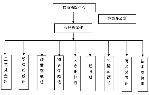 工艺处置组、设备抢修组、疏散警戒组、物资保障组、医疗救护组、通讯组、抢险救援组、污染处置组、技术支持组(具体成员组成及联系方式见附件)。