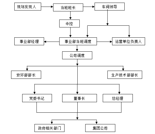为应对公司可能发生的各类安全事故,根据公司实际情况,成立应急指挥中心,在发生安全事故时负责统一指挥、协调处理应急救援工作。应急指挥中心设在152调度室。各事业部成立现场指挥部,由指挥部成员或车间领导为现场总指挥,负责各事业部的一般事件的应急救援工作,受公司指挥中心的垂直领导。