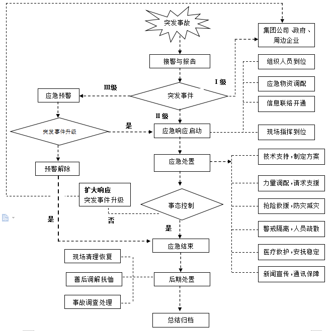 | Ⅲ级(事业部级) | Ⅲ级是指发生泄漏、工艺异常报警等事故,未发生人员受伤,事业部能够迅处理。主要由单一车间、班组人员进行应急处置。 | 运营单位操作人员和技术人员、调度;事业部负责人 |